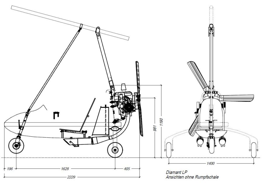 Der Rumpf des Diamant LP ist ein robustes Windkanal- designetes GfK-Monocoque. Durch dessen ausgeklügelte Aerodynamik kann auf eine Widerstand-erzeugende Frontscheibe gänzlich verzichtet werden.